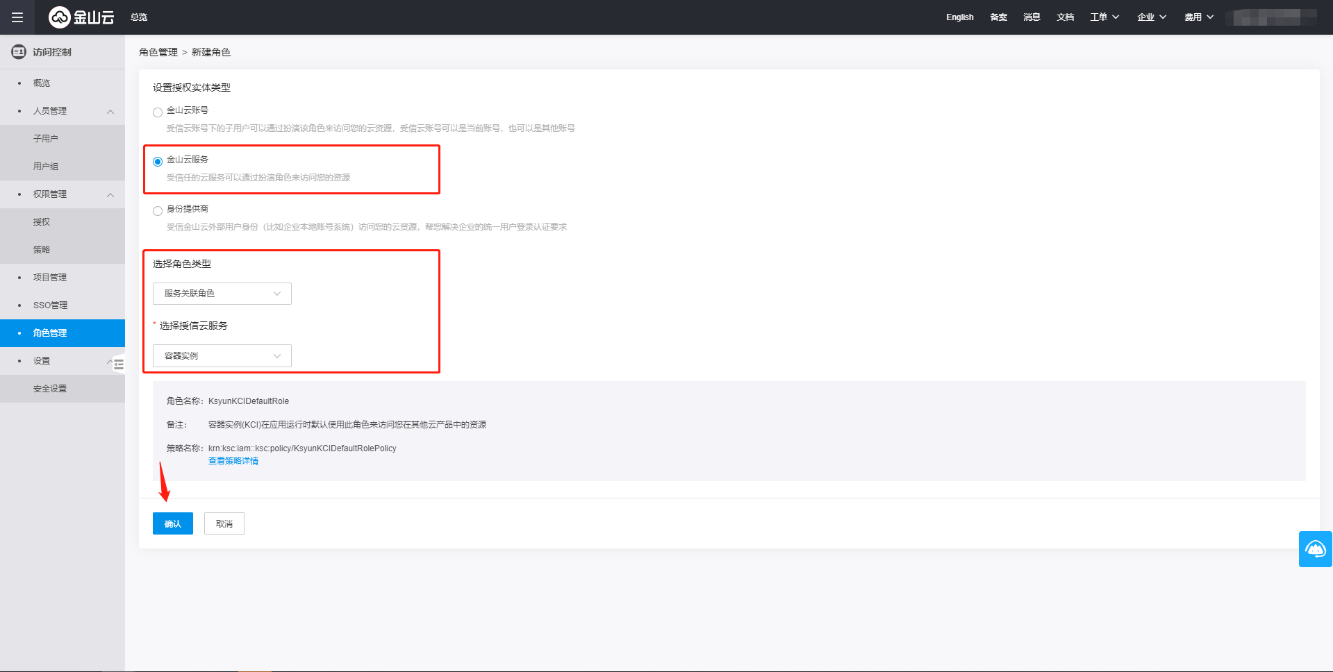 2.授权实体类型选择“金山云服务”,角色类型选择“服务关联角色”,授信云服务选择“容器实例”,点击确认按钮;