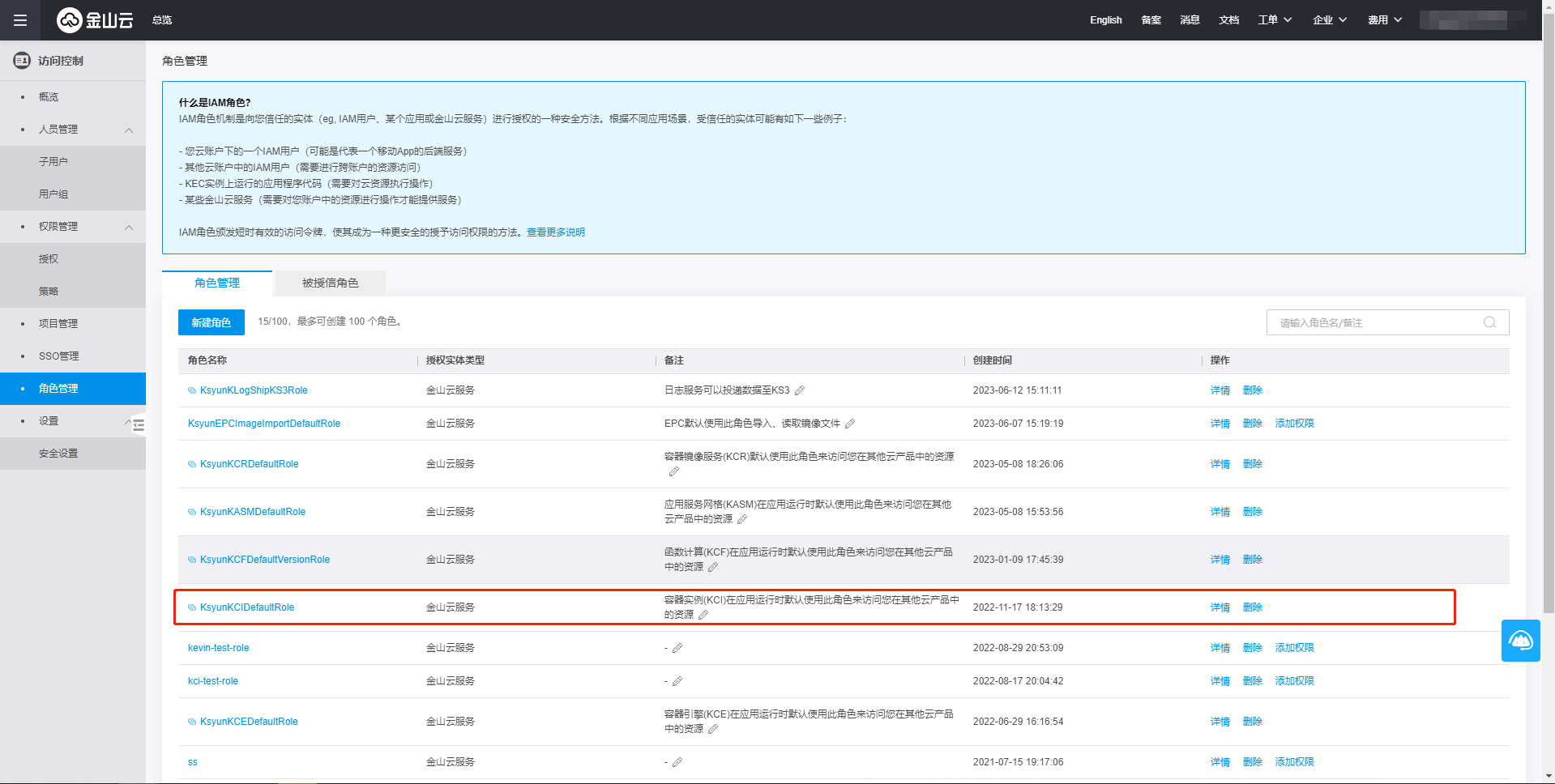 3.在角色列表页出现KsyunKCIDefaultRole角色,即完成了授权。