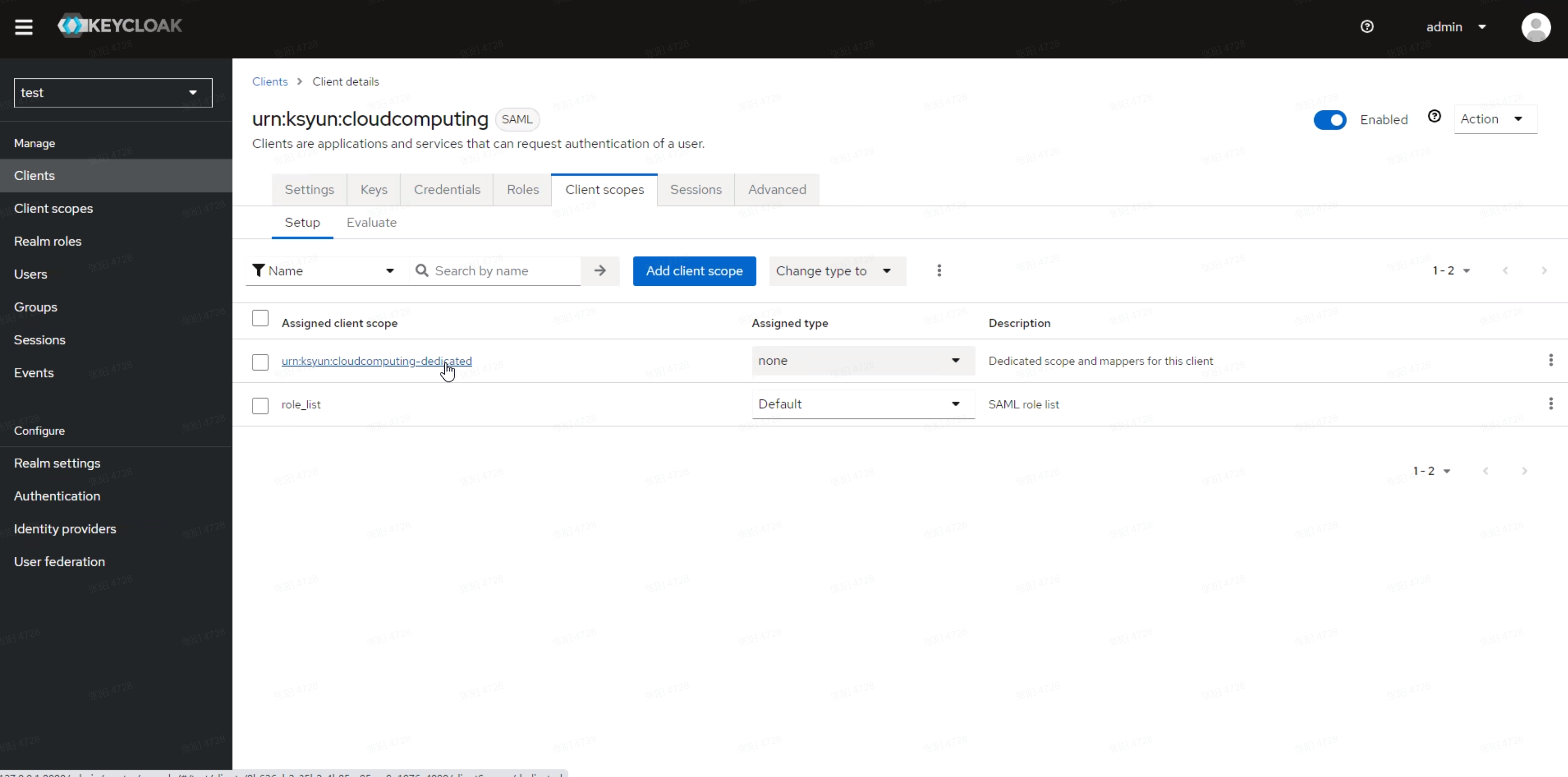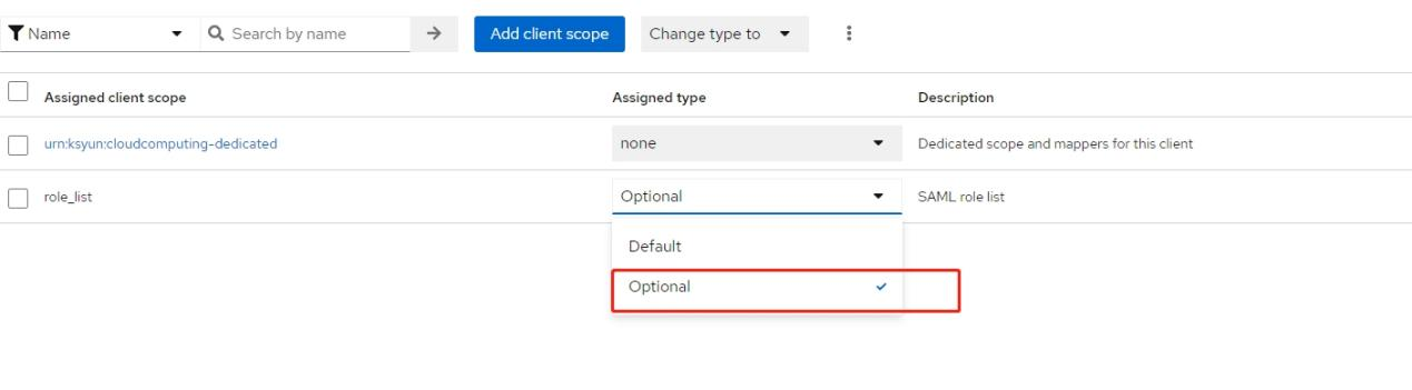 保存后,返回到Client details页的Client scopes将role_list切换为Optional