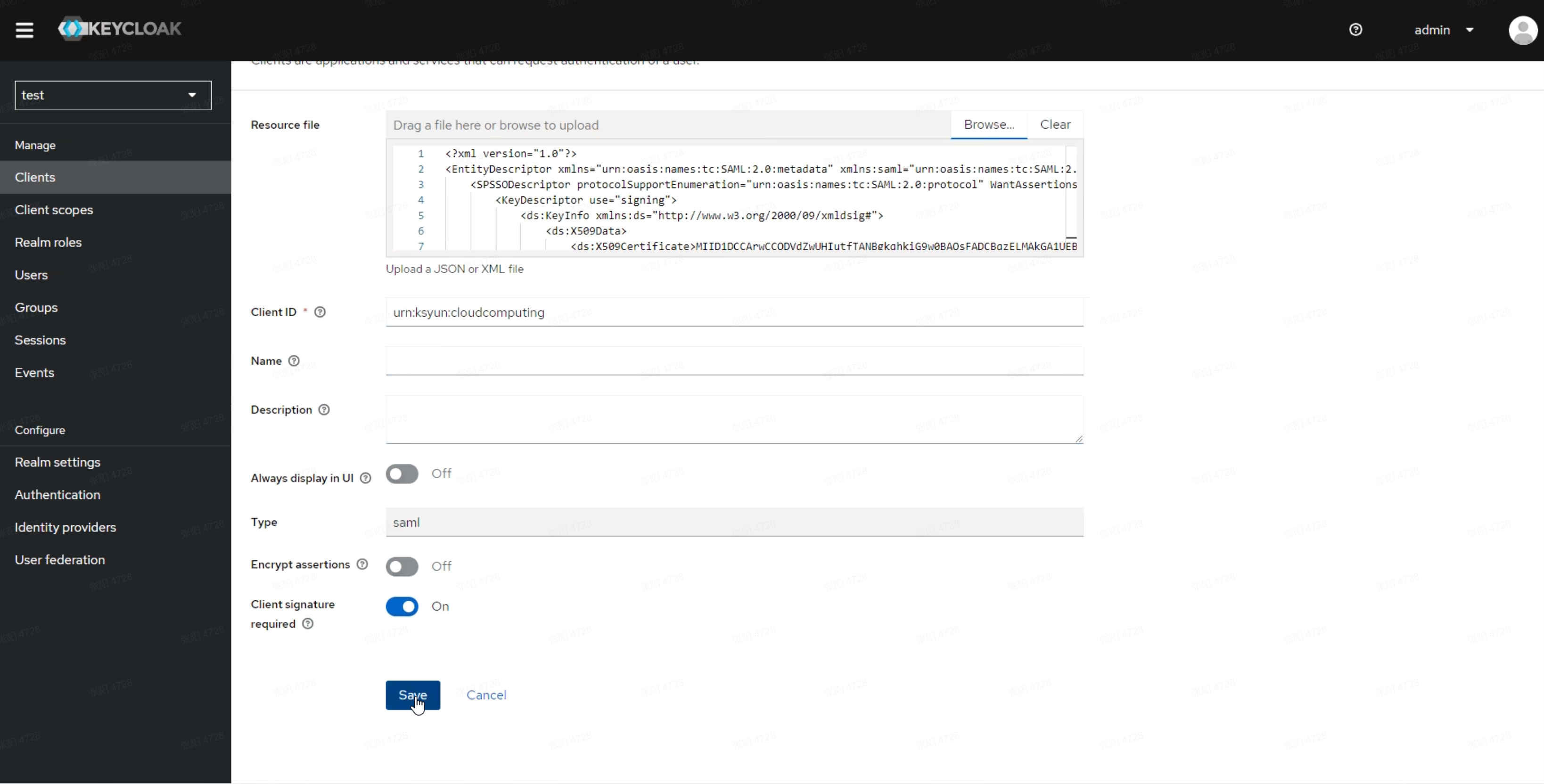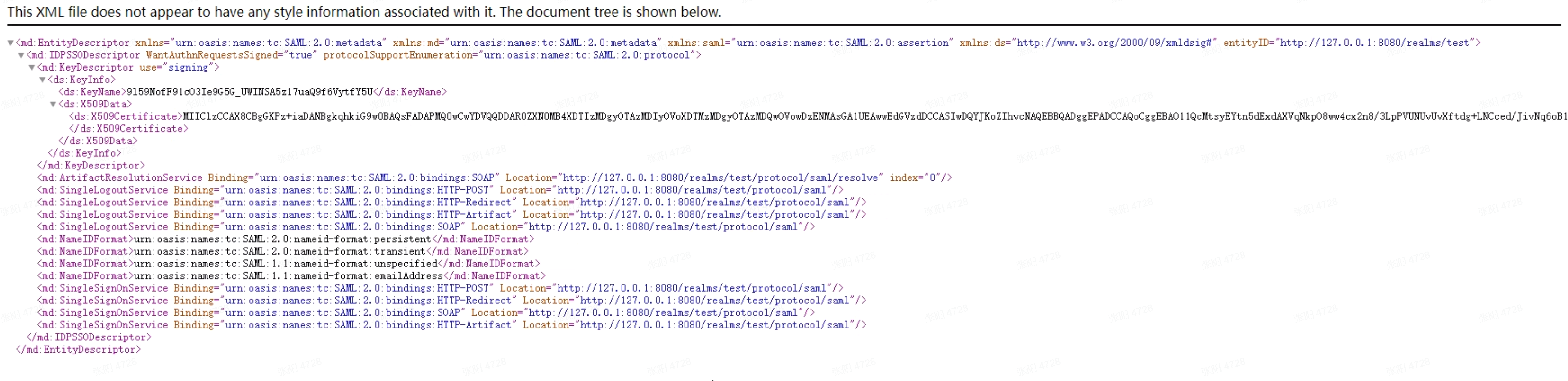 点击Realm Settings菜单中Endpoints中的SAML 2.0 Identity Provider Metadata链接,可查看具体的IDP Metadata内容,将内容保存至本地IdpMetadata.xml文件中