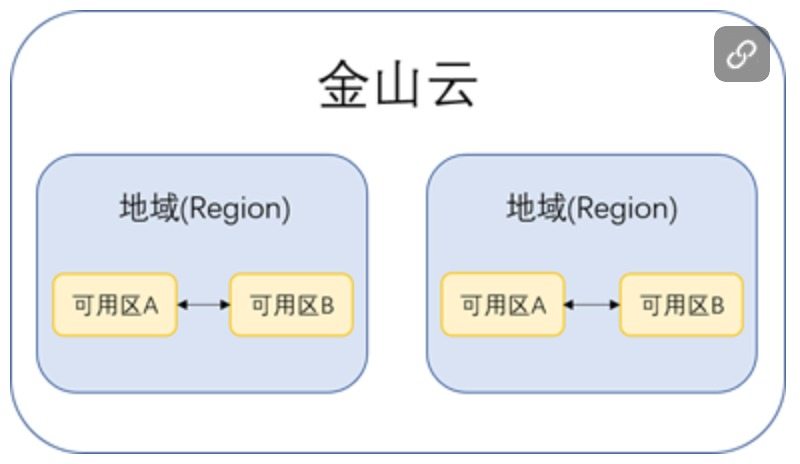 地域和可用区是指金山云提供的资源所分布的物理位置,其关系如下图所示: