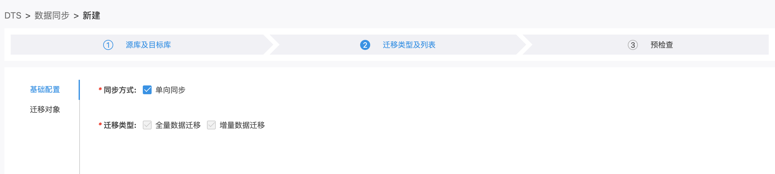 在迁移类型及列表页面,配置迁移类型、迁移对象。