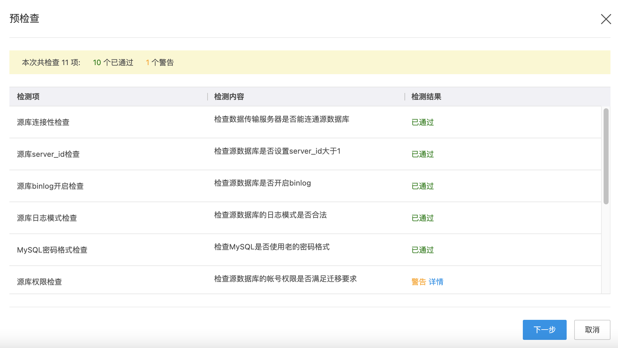 完成配置后单击下一步,在任务详情页面单击预检查进行预检查。