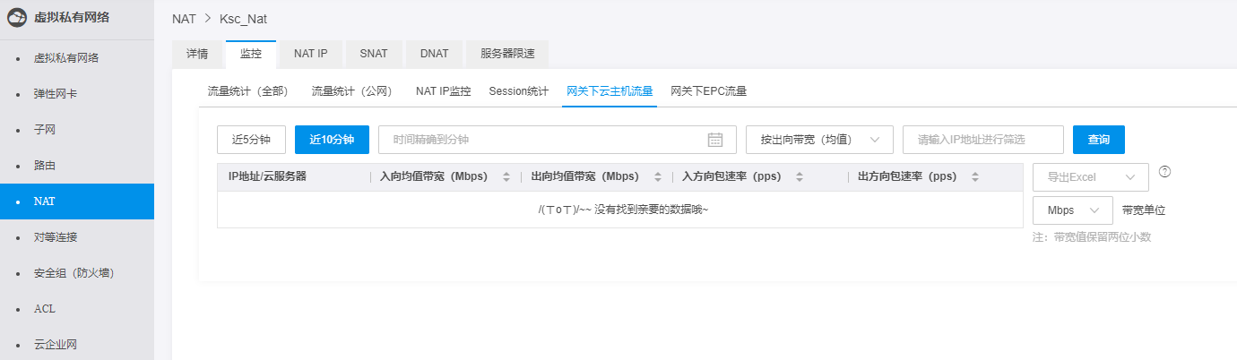 单击“网关下云主机流量”页签,选择”近5分钟“、”近10分钟“或者自定义时间,点击”查询“,可以查看该NAT实例下流量消耗最大的前50个云主机。