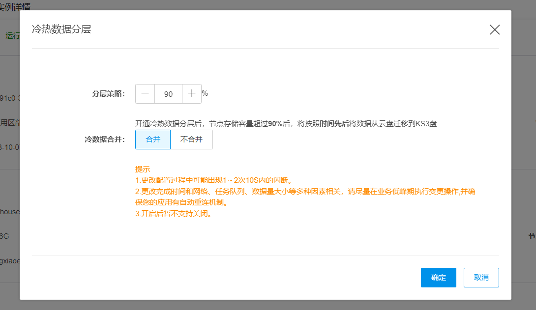 冷热数据分层存储功能开通时,集群会进行重启,重启期间只能查看集群信息,无法进行升配、扩容、修改参数配置等操作。