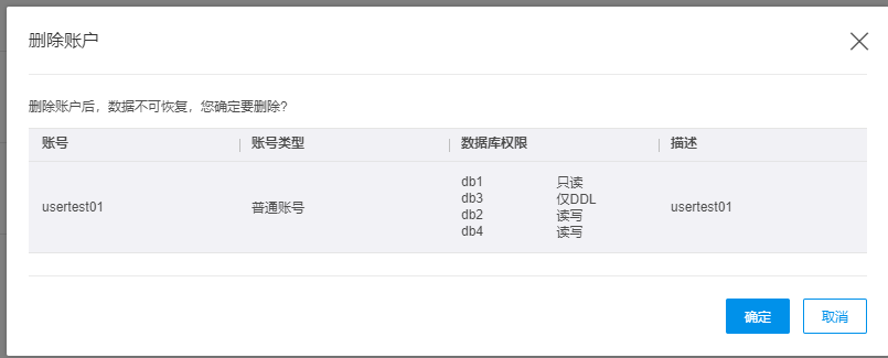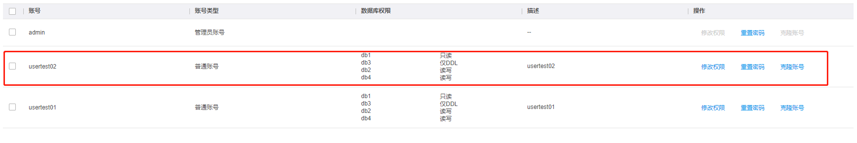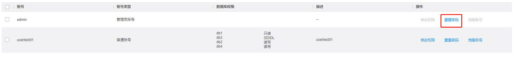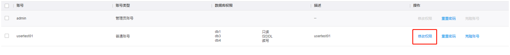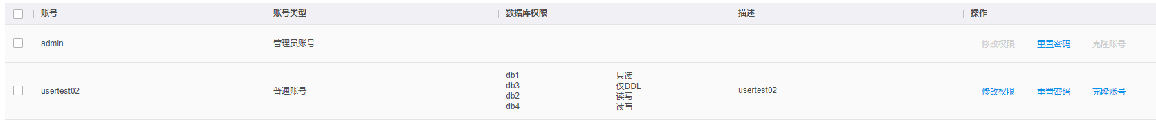 | 账号类型 | 新建账号固定为普通账号;新建实例时创建的账号为管理员账号,一个实例仅有一个管理员账号,最多可创建100个普通账号。 |