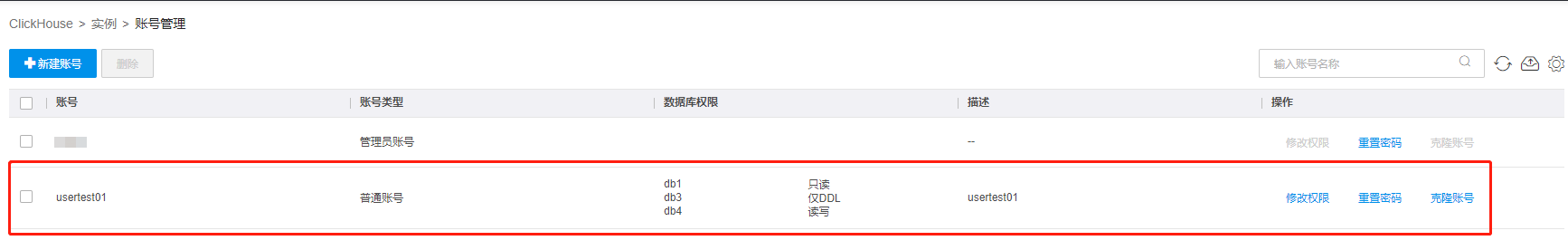云数据仓库ClickHouse支持通过控制台创建数据库账号、修改权限、重置密码、克隆账号和删除账号等操作。