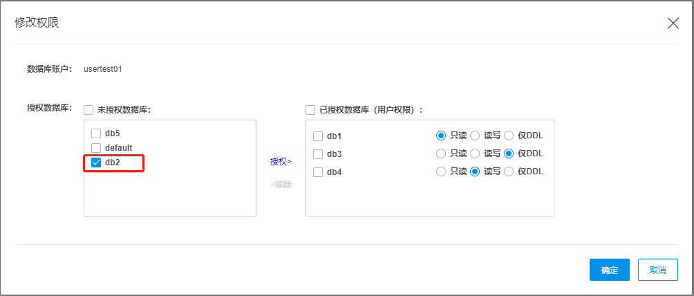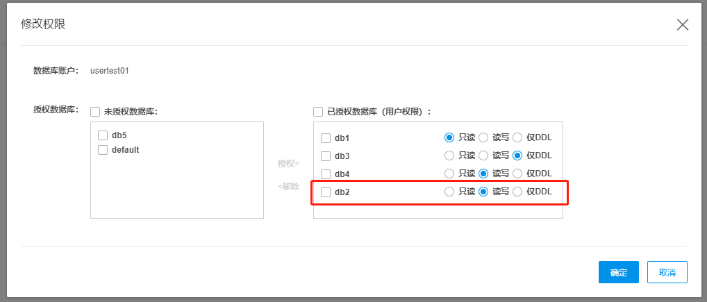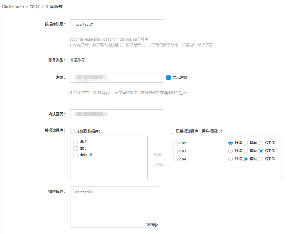 | 授权数据库 | 显示当前数据库列表,支持按照数据维度进行授权。数据权限分为只读(默认)、读写和仅DDL。权限说明如下,只读:SELECT,SOURCES,dictGet;读写:select,SOURCES,dictGet;insert,alter,optimize,TRUNCATE;仅DDL:select;create(不能建库、只能建表),drop; |