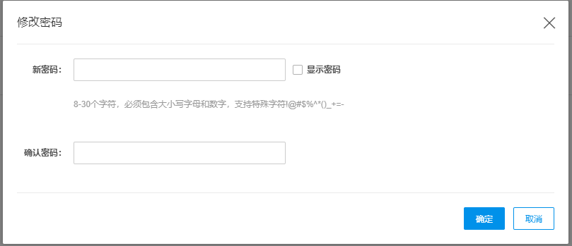 | 密码 | 必填;8-30个字符;必须包含大小写字母和数字;支持特殊字符为!@#$%^*()_+=- |