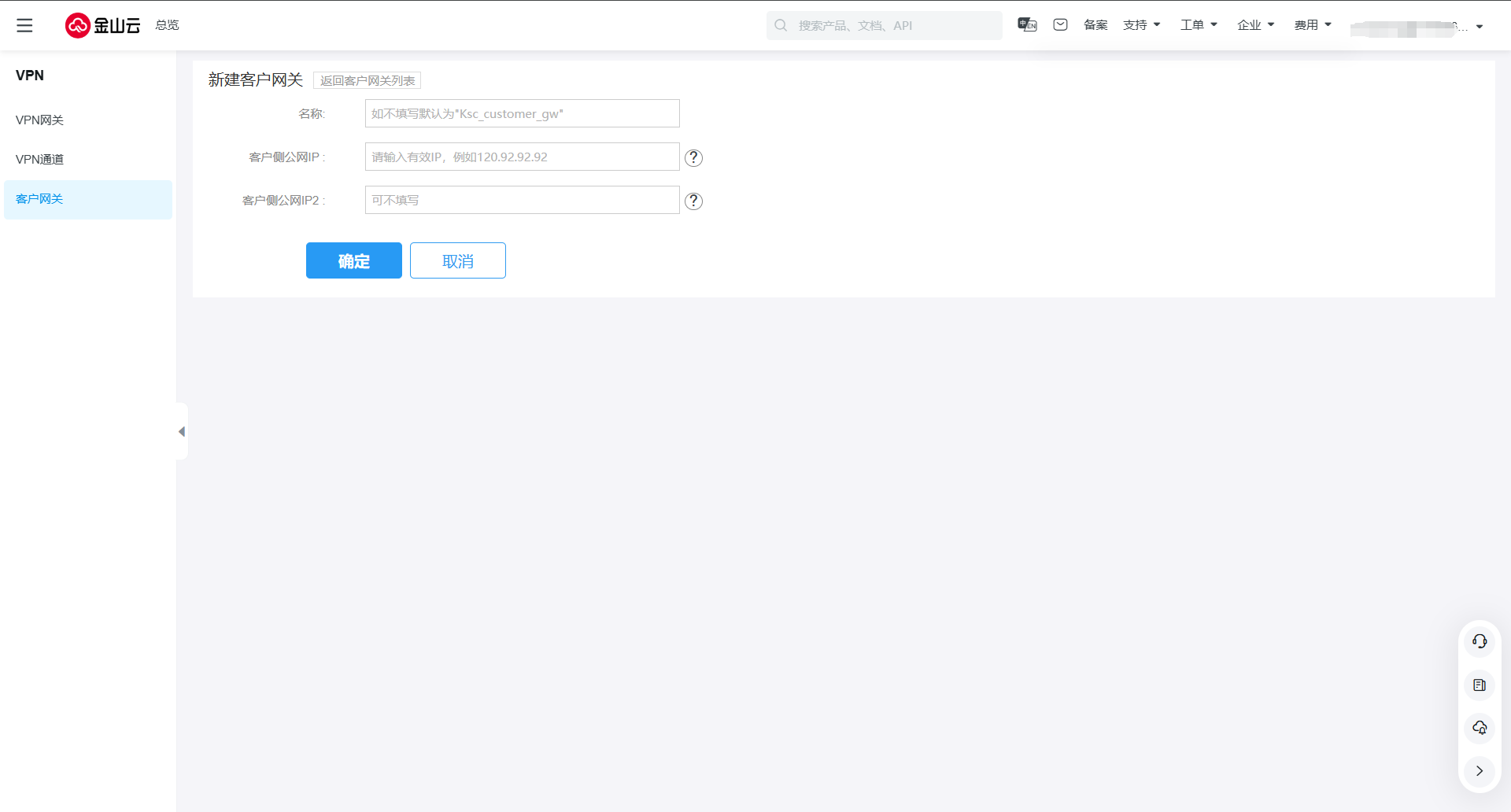 填写客户侧相关信息,客户侧公网IP用于和VPN网关的公网IP互联。如果填写两个不同的公网IP,可以分别和VPN网关公网IP1和公网IP2协商两条隧道;如果填写两个相同的公网IP,只会与VPN公网IP1协商1条隧道。
