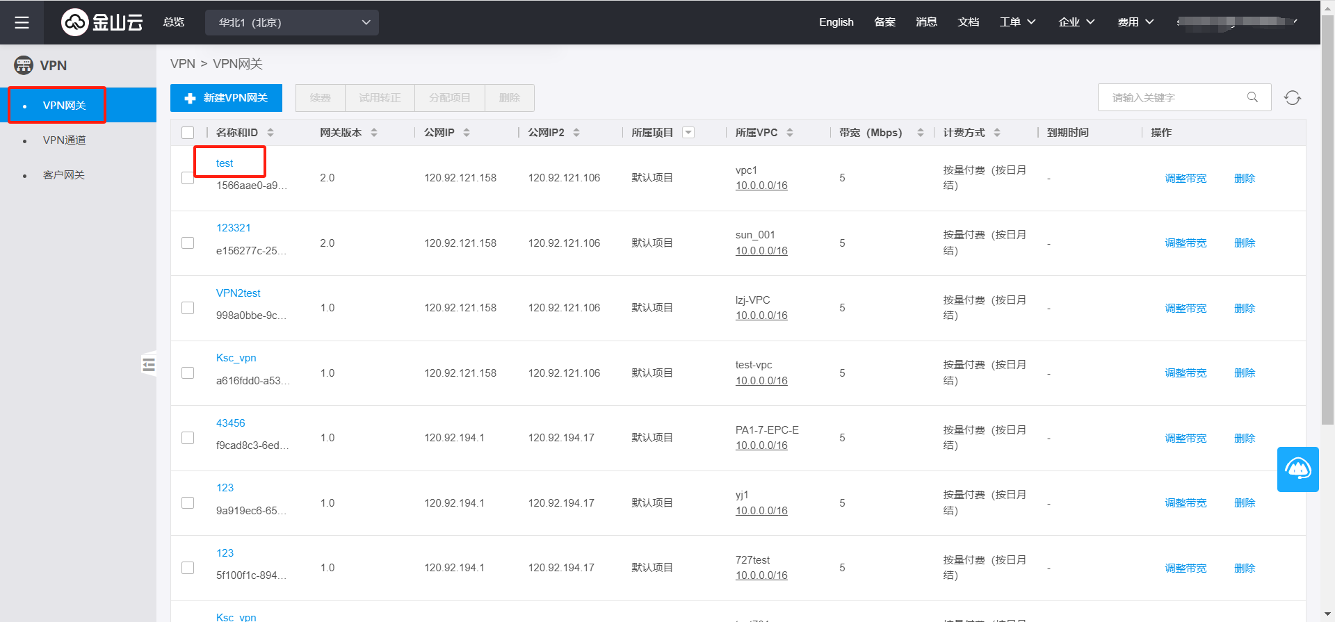 进入VPN控制台,点击VPN网关名称。