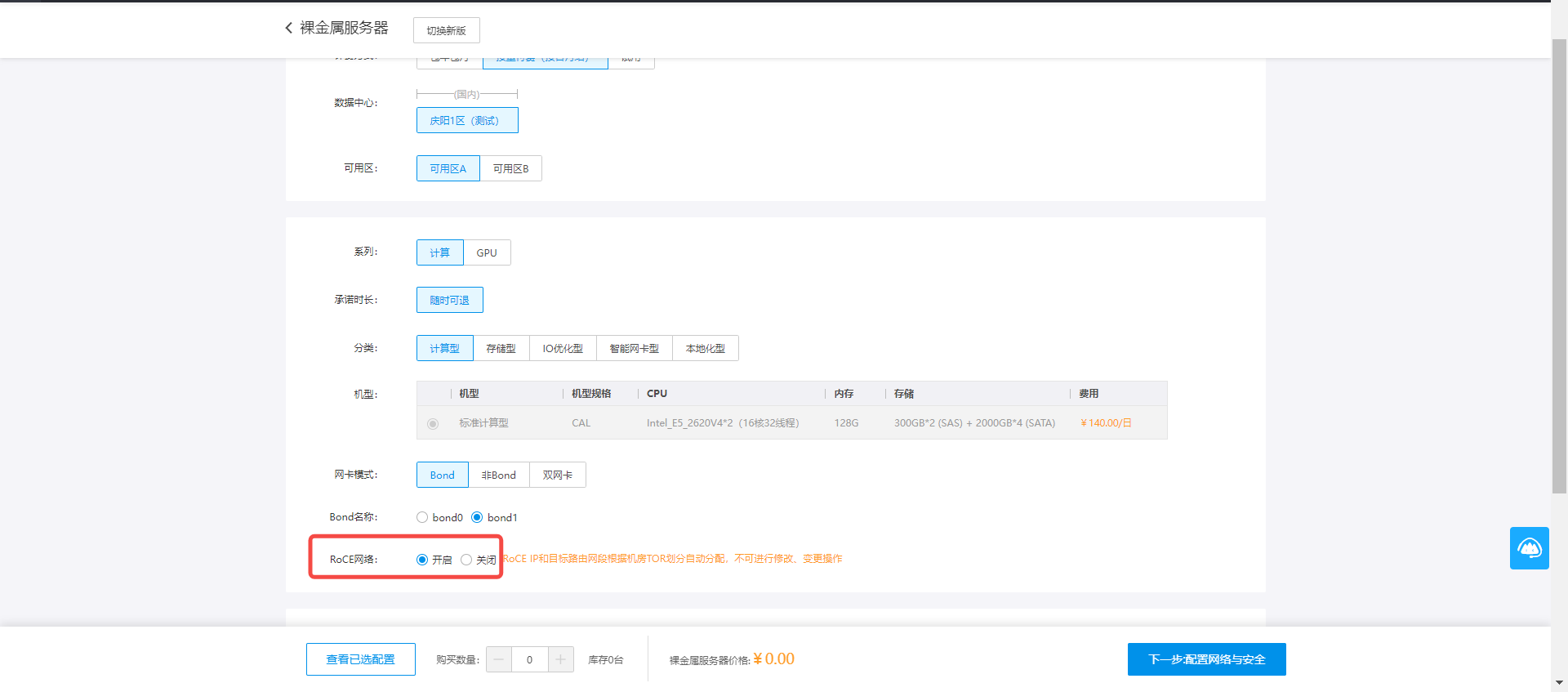 RoCE网络通过白名单形式开放,加白后控制台可以选择开启/关闭RoCE选择不同的库存服务器进行创建实例。