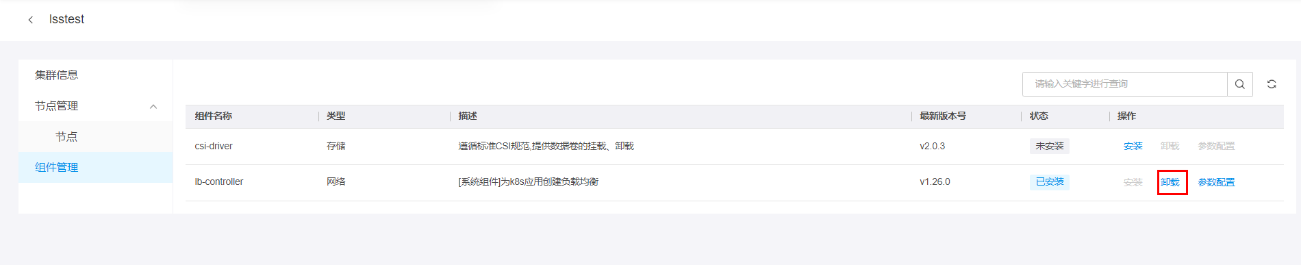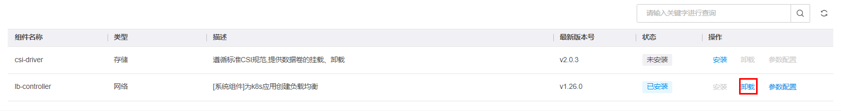 在组件列表中,点击需删除组件所在行右侧的卸载,如下图所示: