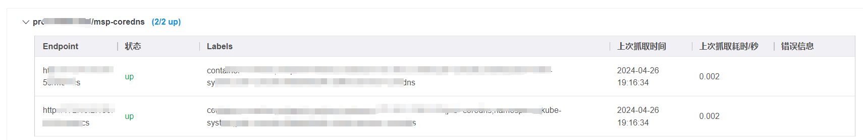 点击Targets,可查看对应监控采集任务的Target详情信息,包括Endpoint状态、Labels信息、上次抓取时间、上次抓取耗时/秒、错误信息。