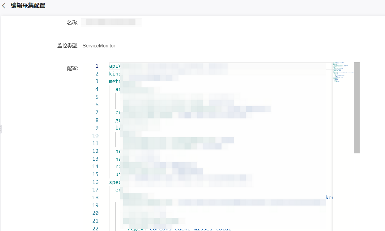 点击列表右侧操作中的编辑,可查看监控任务的名称监控类型与配置,您也可以编辑文本框中的YAML文件对采集配置进行修改。