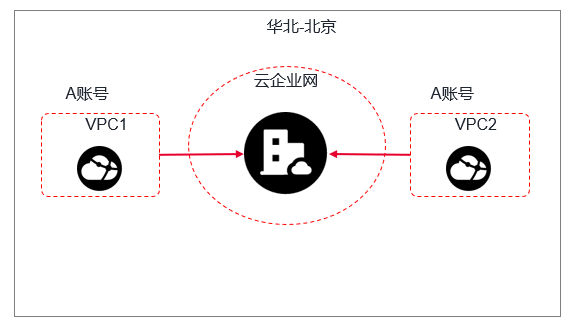 用户同一账号下在金山云华北地域有两个VPC,每个VPC部署了云服务器,两个VPC之间默认不能互通,现需要将两个VPC在路由层面进行打通,以满足业务需要。