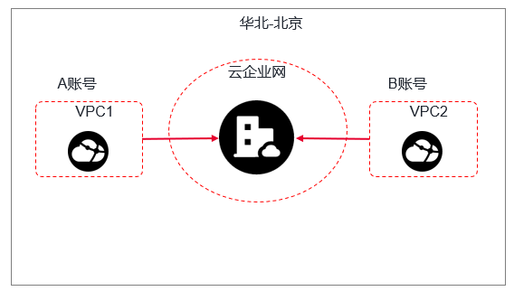 用户的A账号在金山云华北地域有VPC1,B账号在金山云华北地域有VPC2,每个VPC部署了云服务器,两个VPC之间默认不能互通,现需要将两个VPC在路由层面进行打通,以满足业务需要。