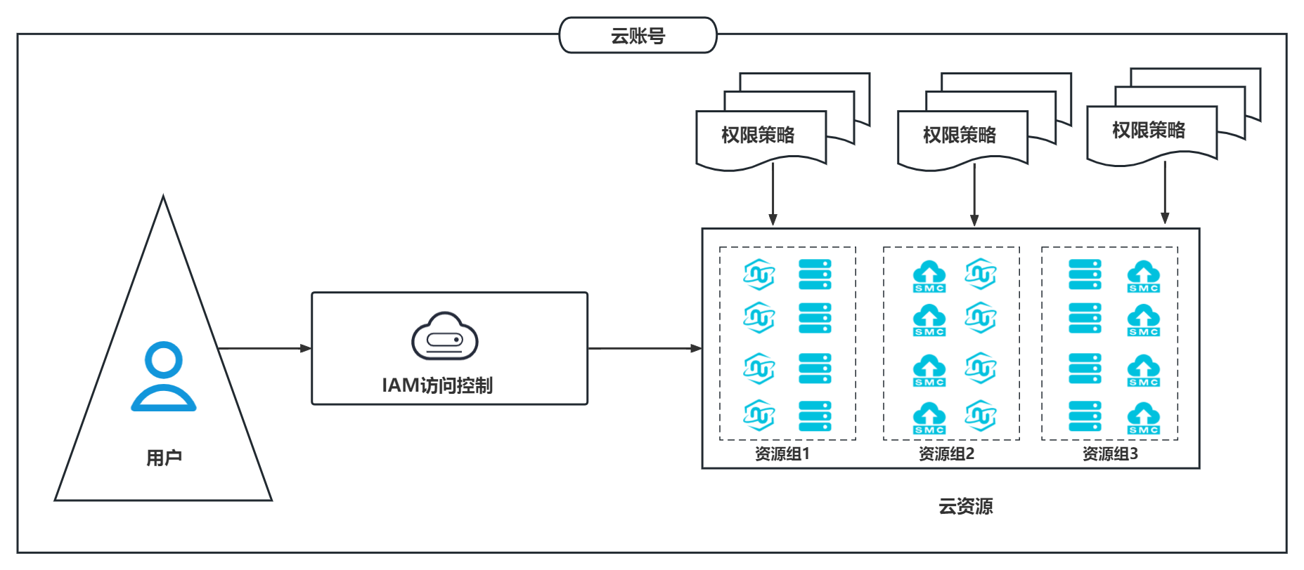 - 资源组内授权:在某个资源组内对一个IAM身份主体添加权限策略时,该策略的可授权范围仅是该资源组内的资源。