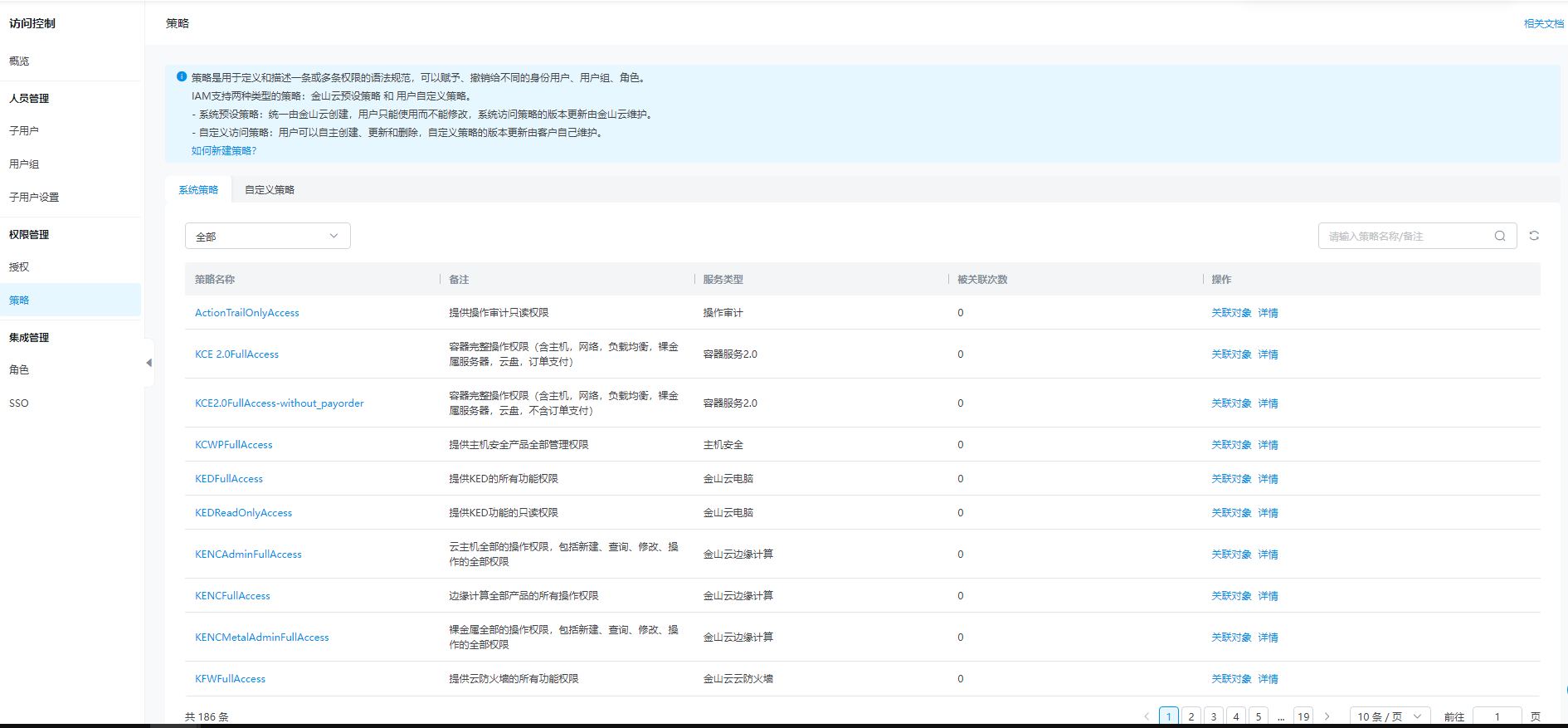 在权限策略页面,选择策略类型,切换系统策略或自定义策略。