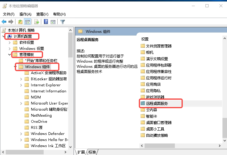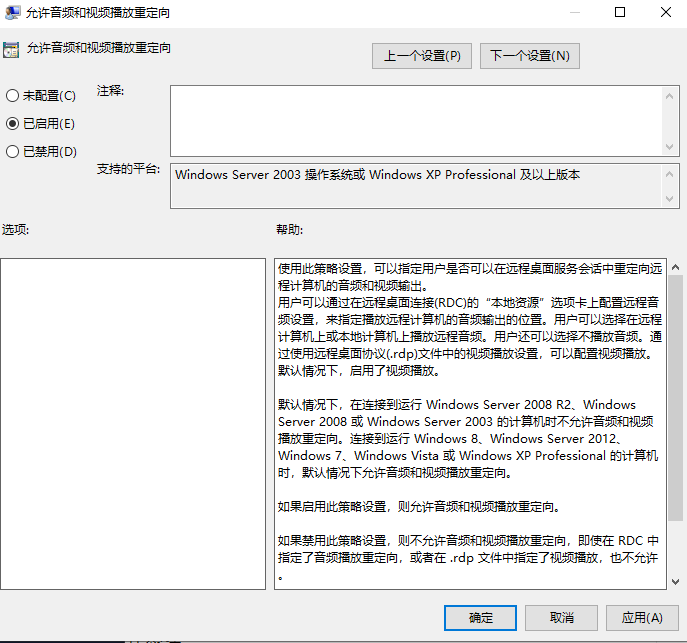 依次单击“计算机配置 > 管理模版 > windows 组件 > 远程桌面服务 > 远程桌面会话主机 > 设备和资源重定向”,打开“允许音频和视频播放重定向”。