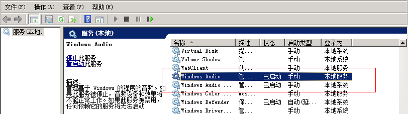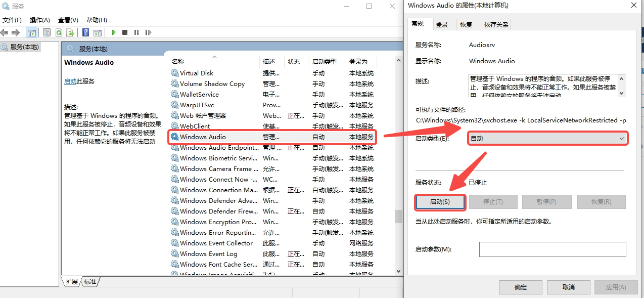 找到“Windows Audio”服务,并按如下方式设置。