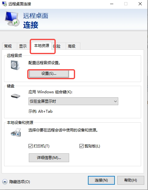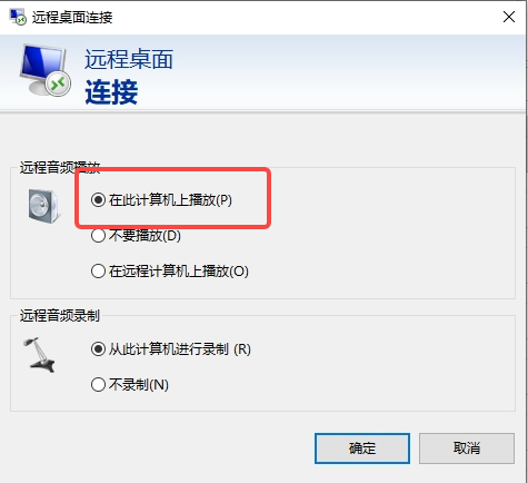 以上配置调整完成后,打开本地远程桌面软件(mstsc),单击“选项 > 本地资源”,在远程音频处单击“设置”,弹出的选项卡中的远程音频播放处,选择“在此计算机中播放”,单击“确定”。