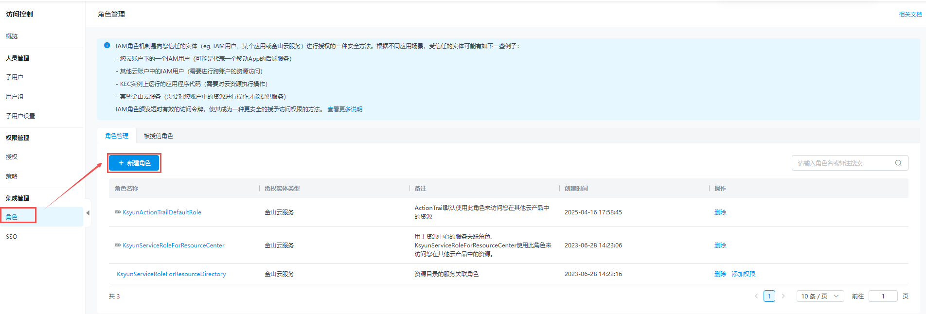 选择 集成管理 > 角色 ,进入到角色管理页面。