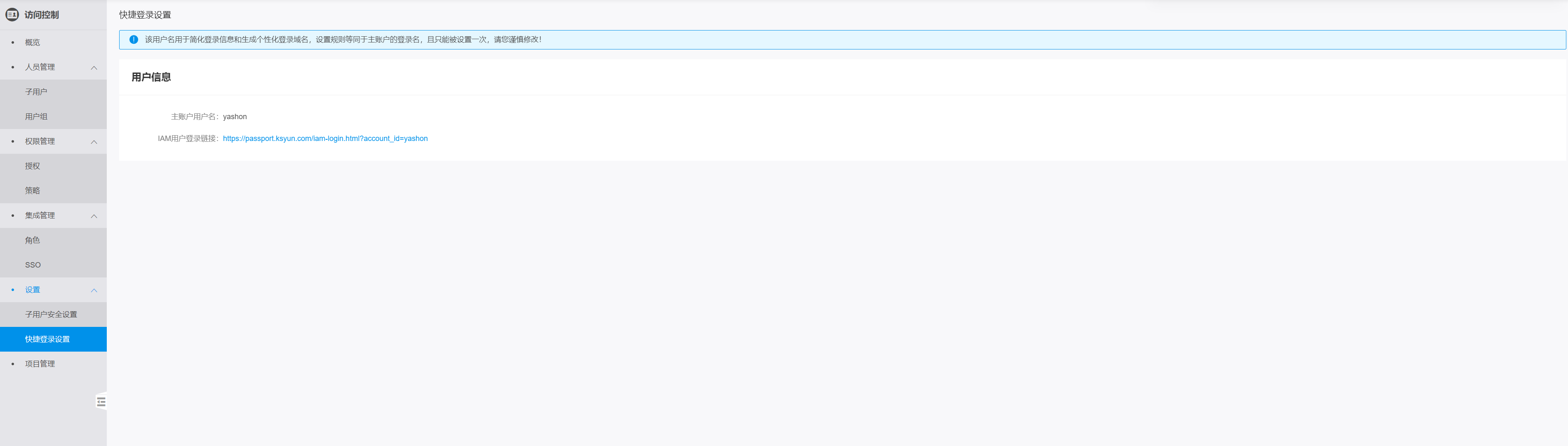 点击快捷登录设置,链接地址即为子用户登录地址:
