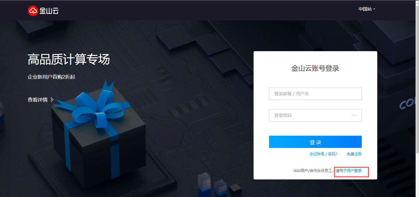 在官网登录页,点击右下角子用户登录。