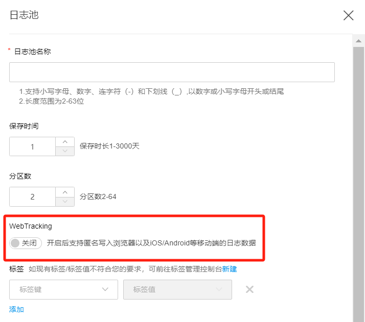 打开创建/编辑日志池页面,开启Web Tracking配置项的开关。