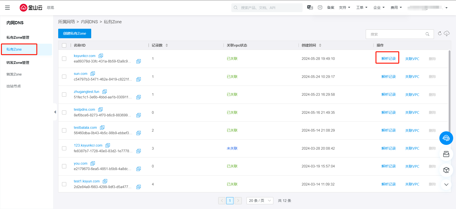 1.登录到内网DNS控制台 - 私有Zone列表页,点击操作列解析记录,或点击需要修改解析记录的私有Zone名称,进入解析记录tab。