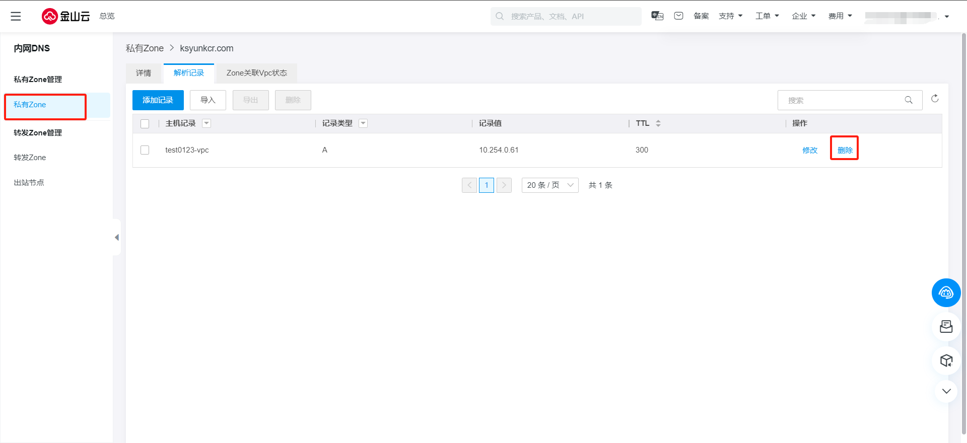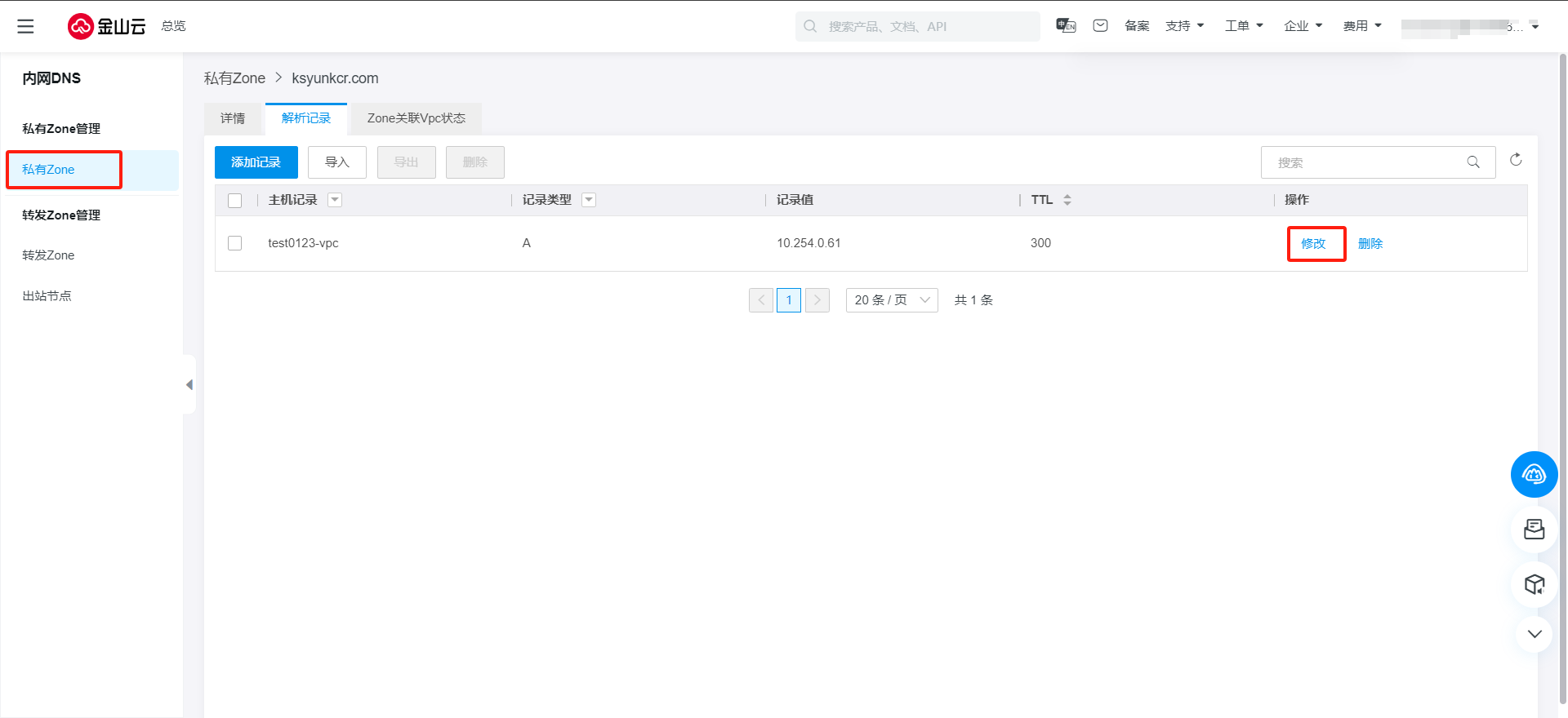 1.登录到 内网DNS 控制台 - 私有Zone列表页,参考修改解析记录,进入解析记录tab。
