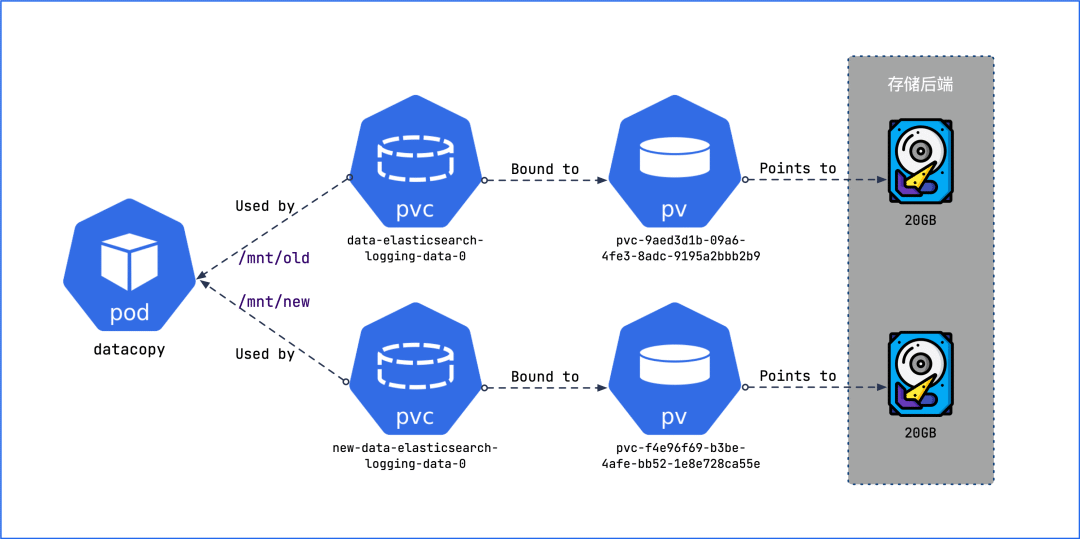 迁移存储的理想状态是使用旧的 PVC,并将其指向新的 PV,这样工作负载的 YAML 配置清单就不需要做任何改变。但 PVC 和 PV 之间的绑定关系是不可更改的,要想让它们解绑,必须先删除旧的 PVC,再创建同名的 PVC,并将旧的 PV 与它绑定。