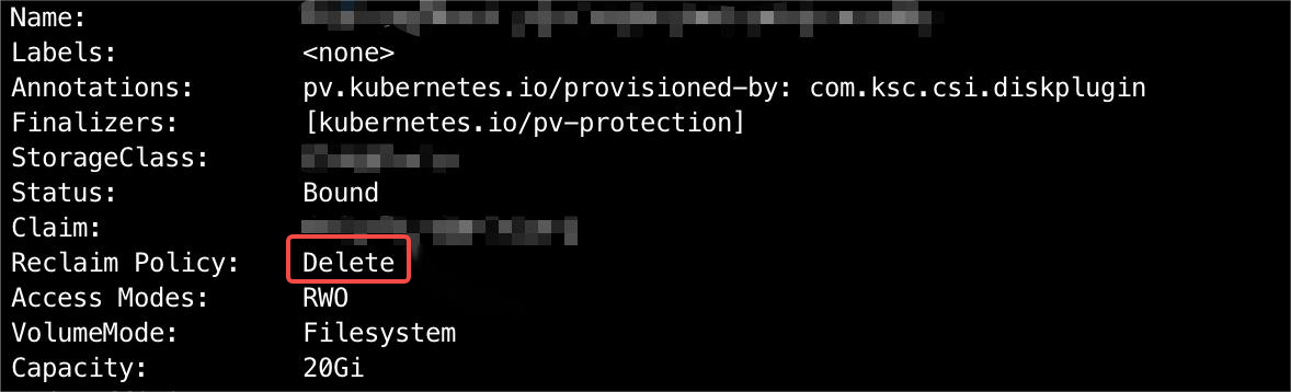 执行命令 kubectl describe pv <pv-name>,分别查看新旧 PV 的回收策略: