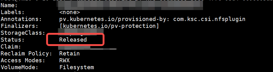 在创建最终的 PVC 之前,我们必须要确保新创建的 PVC 能够被绑定到新的 PV 上。通过命令kubectl describe pv <pv-name>可以看到新 PV 目前处于释放状态,不能被最终的 PVC 绑定: