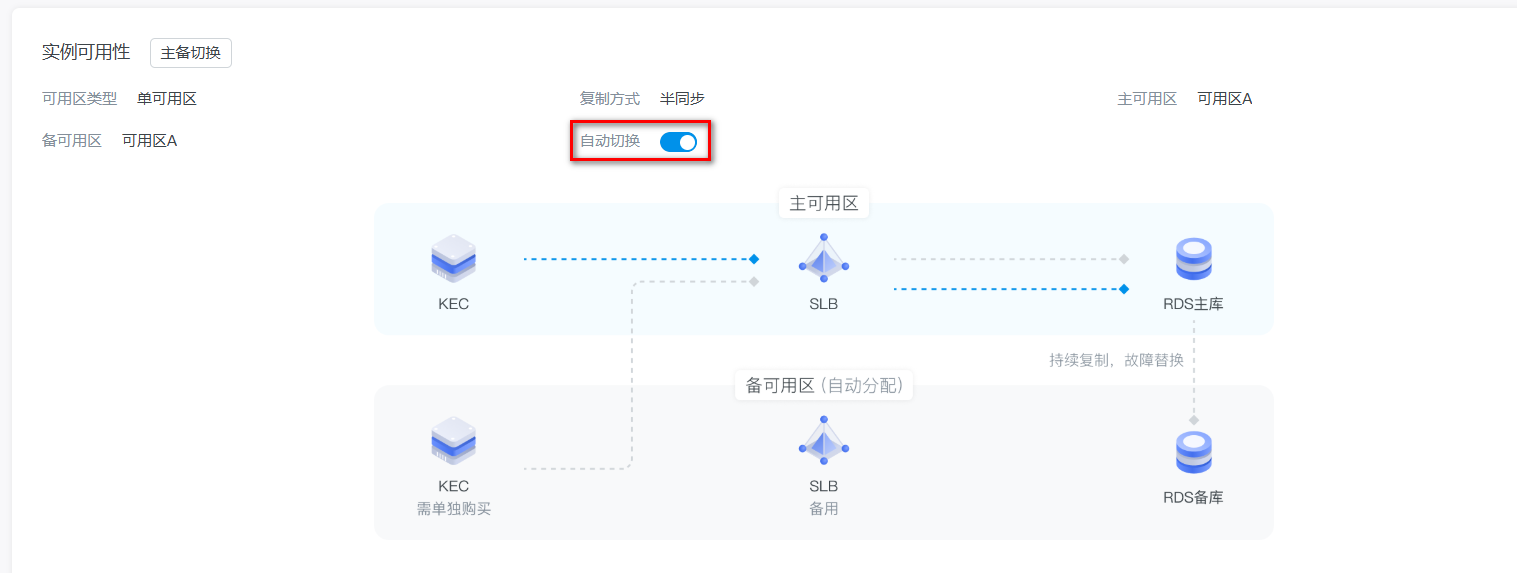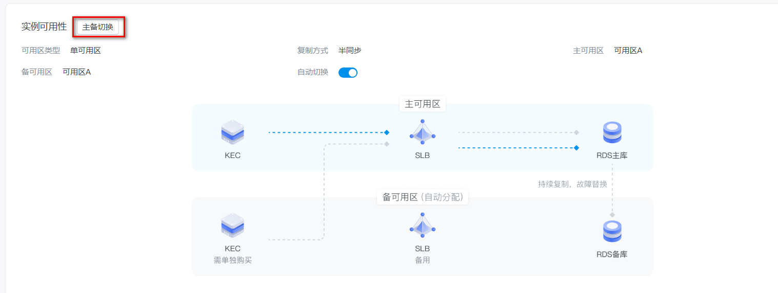 KRDS for MySQL支持高可用功能。当主节点故障时,会自动触发主备切换,将服务切换到新的主节点,从而保障实例的高可用性。此外,您还可以手动进行主备切换。