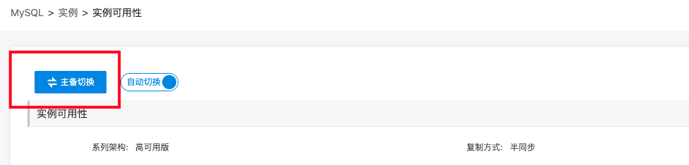 KRDS for MySQL支持高可用功能。当主节点故障时,会自动触发主备切换,将服务切换到新的主节点,从而保障实例的高可用性。此外,您还可以手动进行主备切换。