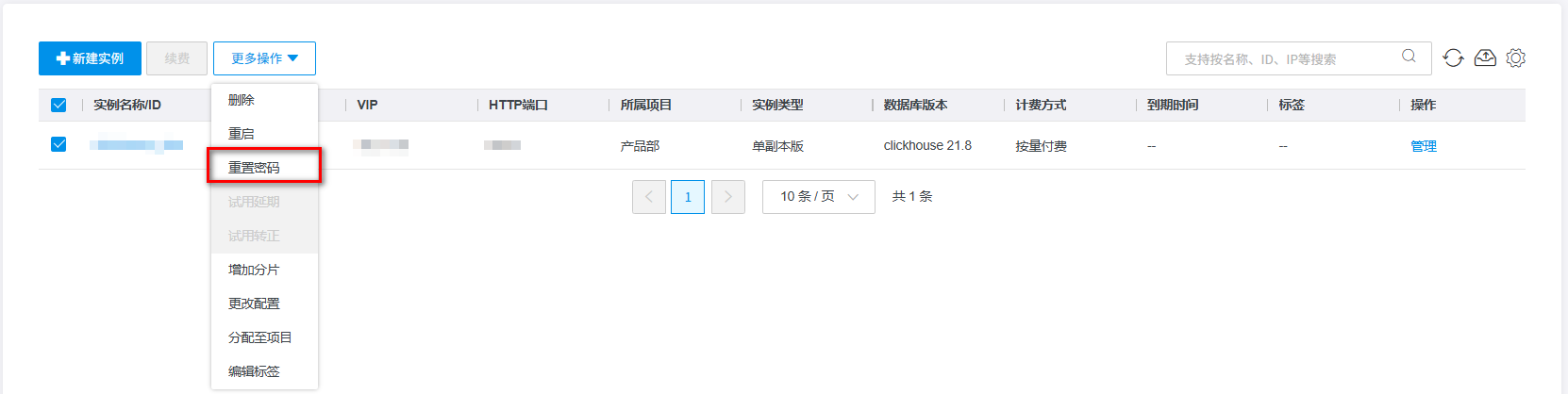 2.勾选您需要重置密码的实例,点击更多操作-重置密码,弹出重置密码窗口。