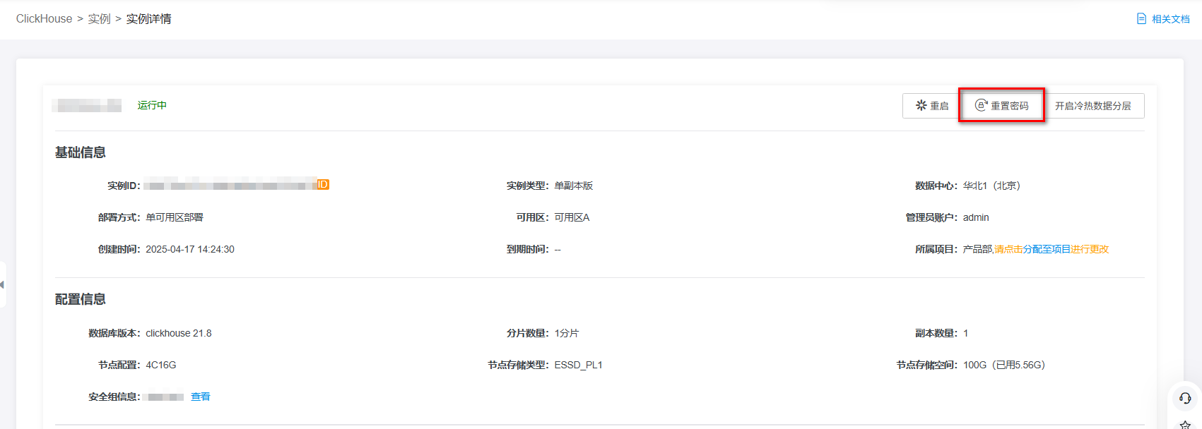 或在实例列表中点击管理,进入到实例详情页,点击重置密码。弹出重置密码窗口。