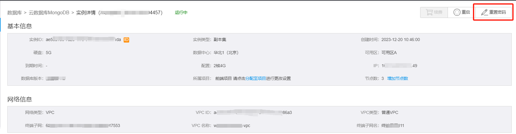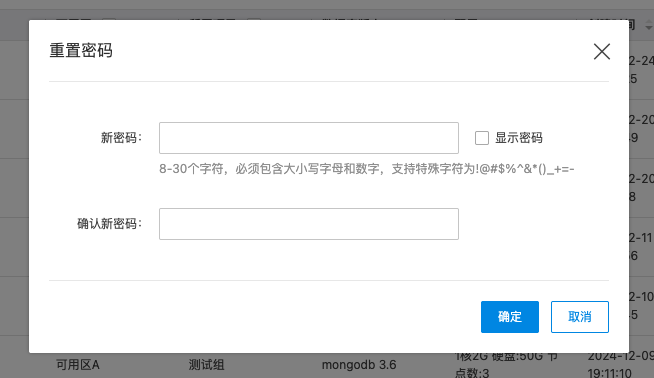 或在实例列表中点击管理,进入到实例详情页,点击重置密码。弹出重置密码窗口。