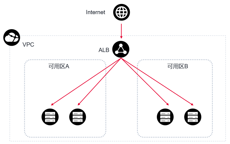 对于可靠性较高的业务,需要考虑机房故障场景下的业务连续性,因此在规划业务部署时,需要在不同可用区部署该业务的服务节点。使用独享型SLB作为前端的负载分发节点,可实现业务流量的跨可用区转发,即使出现单个可用区的服务不可用,独享型SLB可以感知到服务异常,将流量转发到正常的可用区,业务的连续性不受影响。