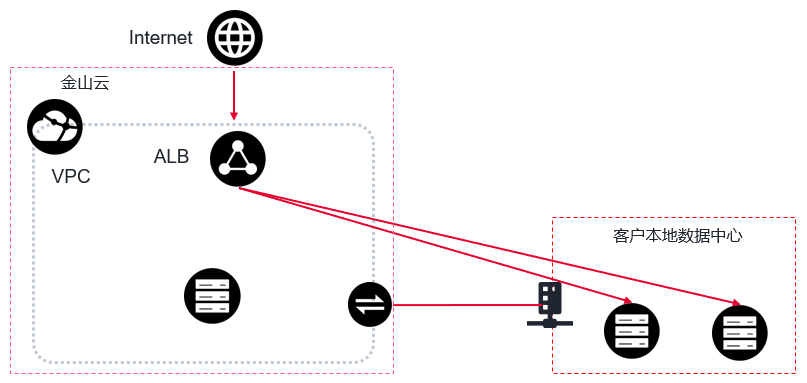 客户的业务通过混合云部署,在金山云和本地数据中心同时有服务节点,或者服务节点部署在本地数据中心,前端公网IP和负载均衡使用金山云产品时,可通过独享型SLB进行混合云场景的业务分发。