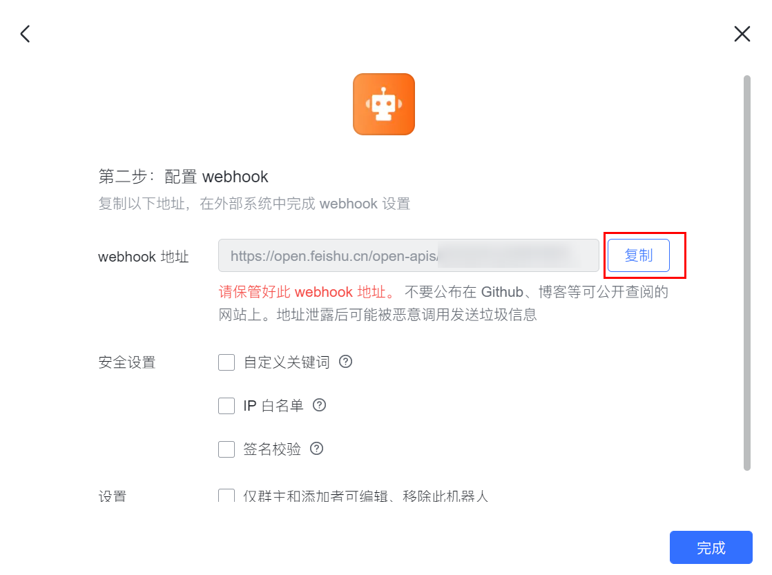 5. 配置完成后,单击完成,在跳转框中复制 Webhook 地址。