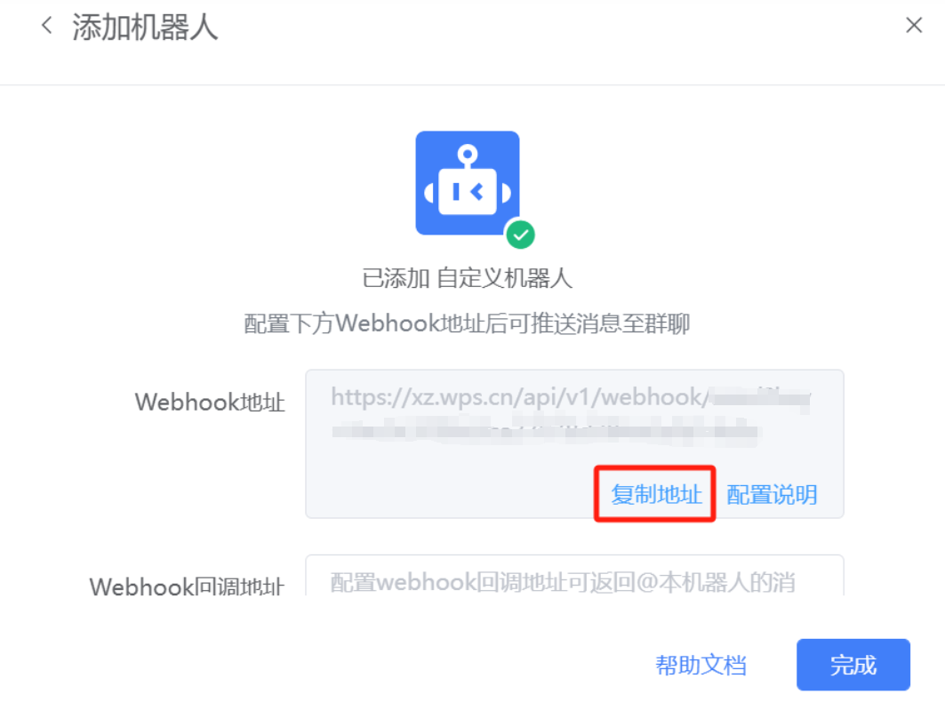 5. 配置完成后,单击完成,在跳转框中复制 Webhook 地址。