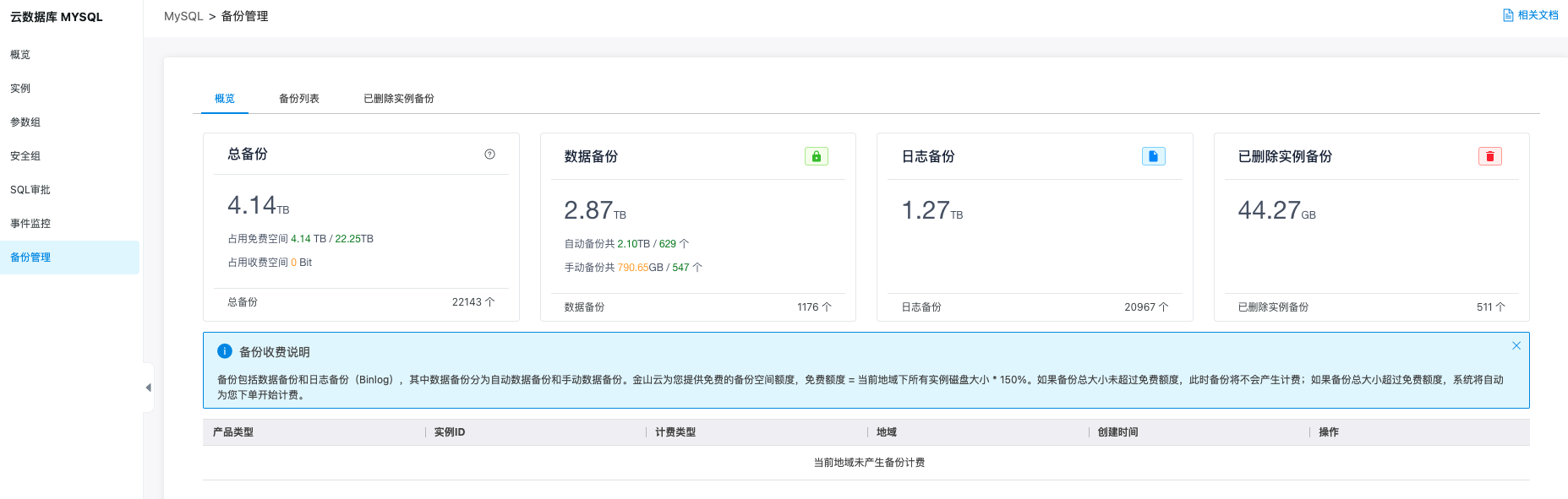 概览页可查看对应地域的备份信息:总备份、数据备份、日志备份的空间大小和数量,以及总备份的免费空间占用情况。