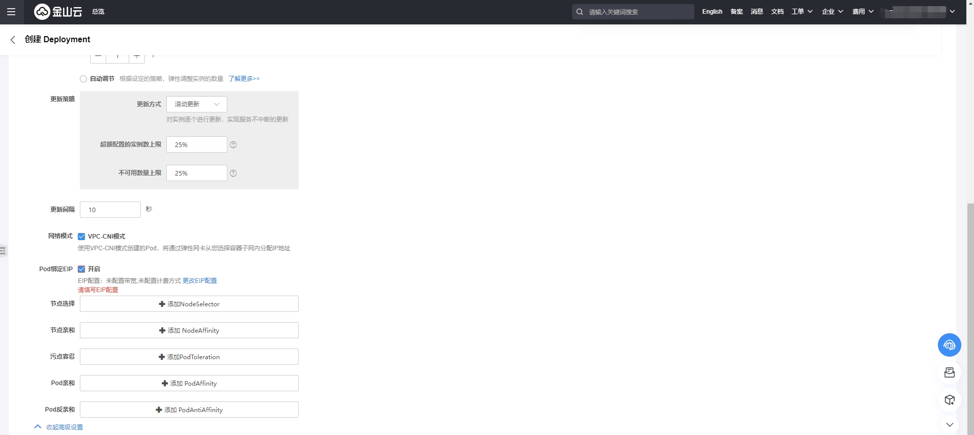 创建Deployment类型工作负载,在部署配置中点击”展开高级配置“,选中”VPC-CNI“网络模式,在开启Pod绑定EIP,并填写EIP相关配置,完成Deployment创建。