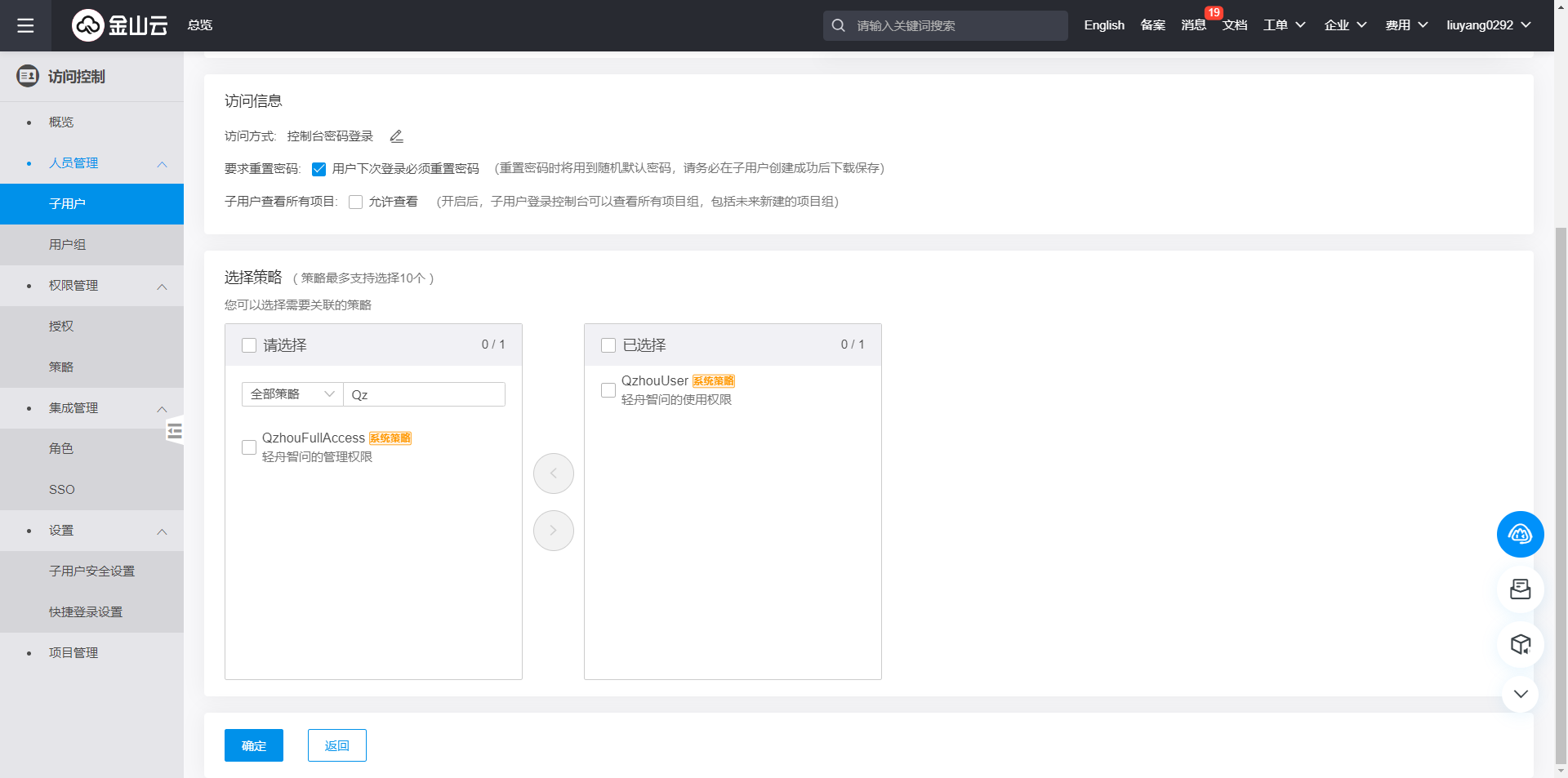 子账号用户身份设置,主账号可以对用户身份以及可使用策略进行选择,授予QzhouUser策略权限。