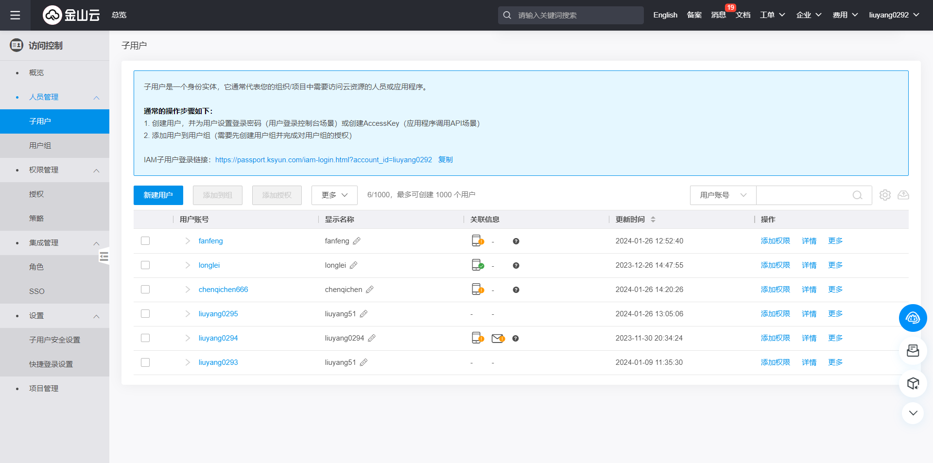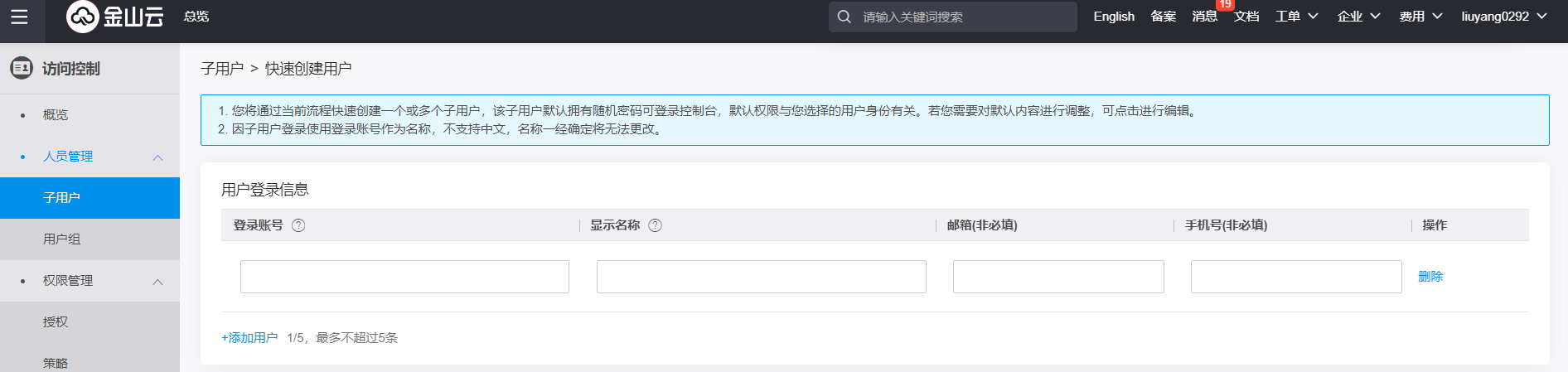 子账户查看,在这里可以查看当前账户下的子账户,并对子账户进行权限分配,点击新建用户进入子账户创建页。