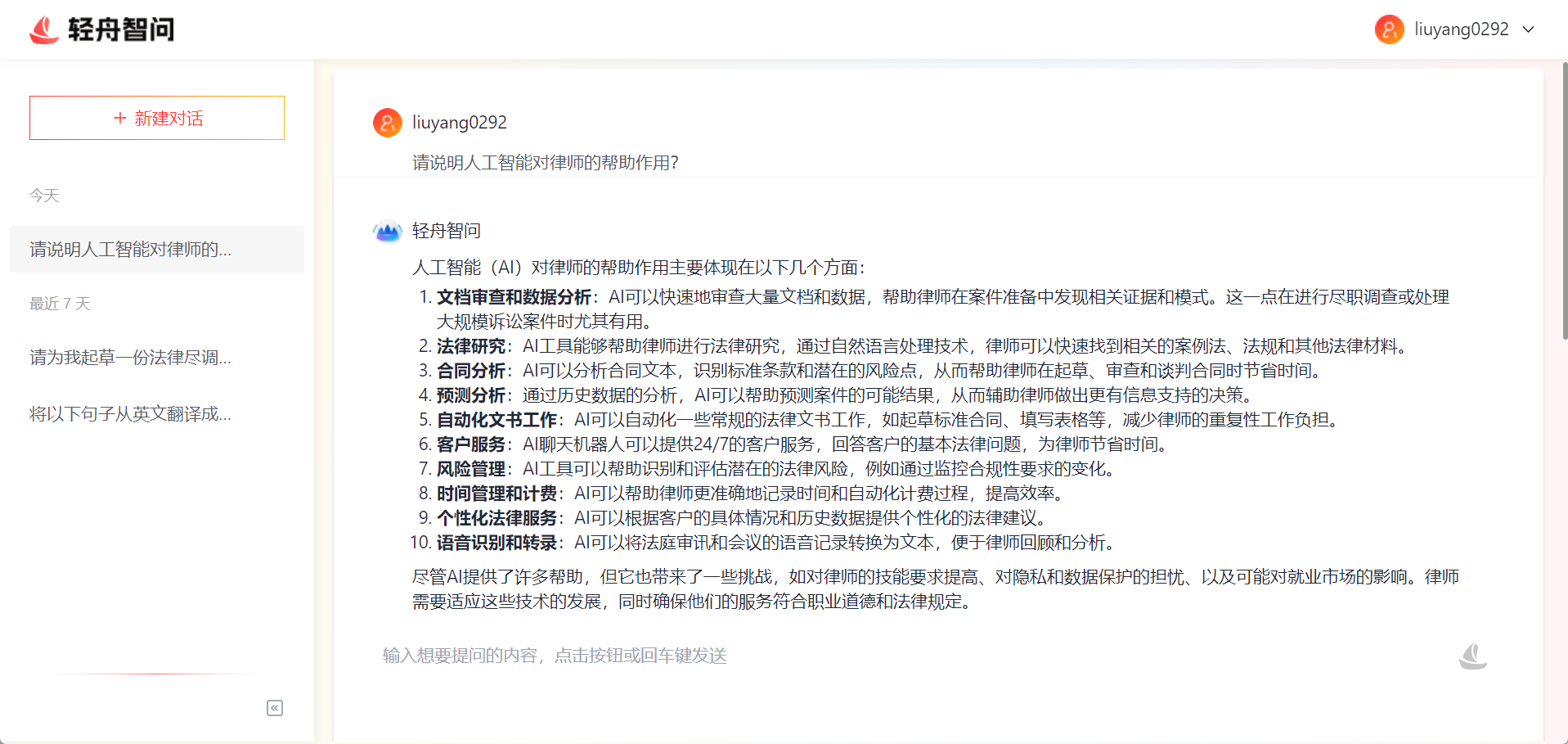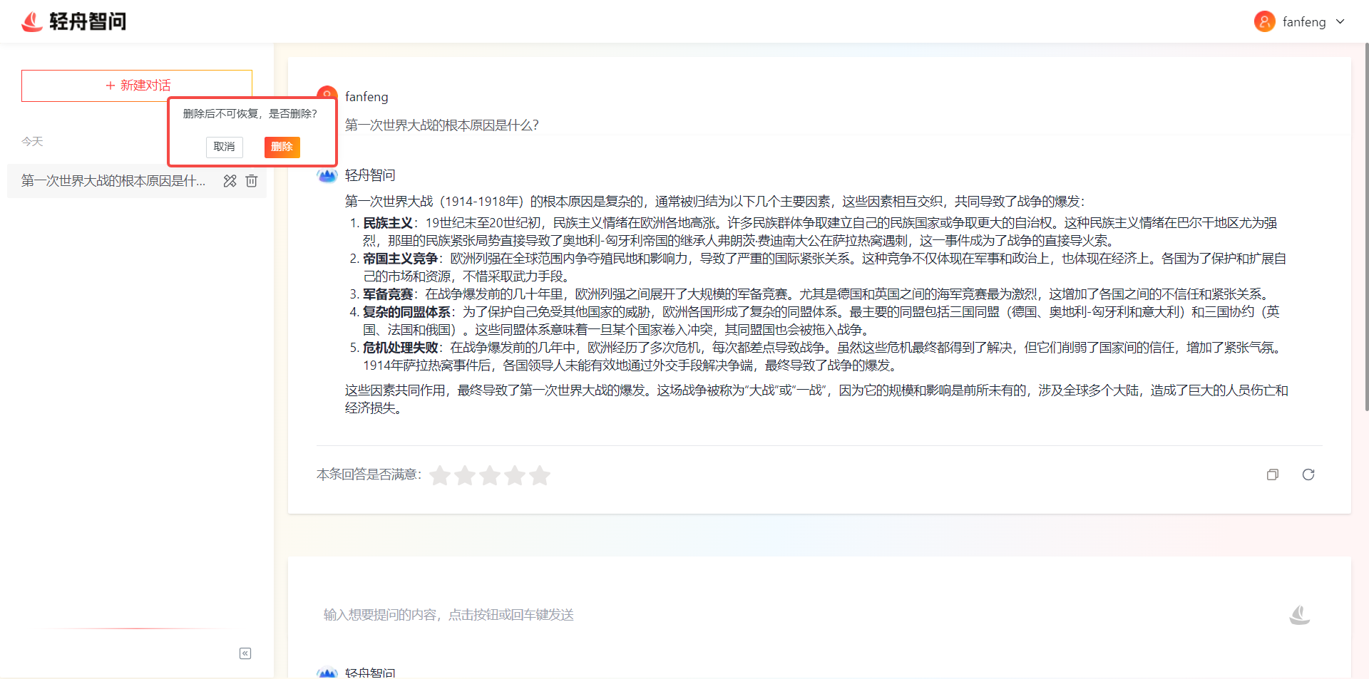 历史对话:问答页面左侧展示历史对话列表,按时间倒序。