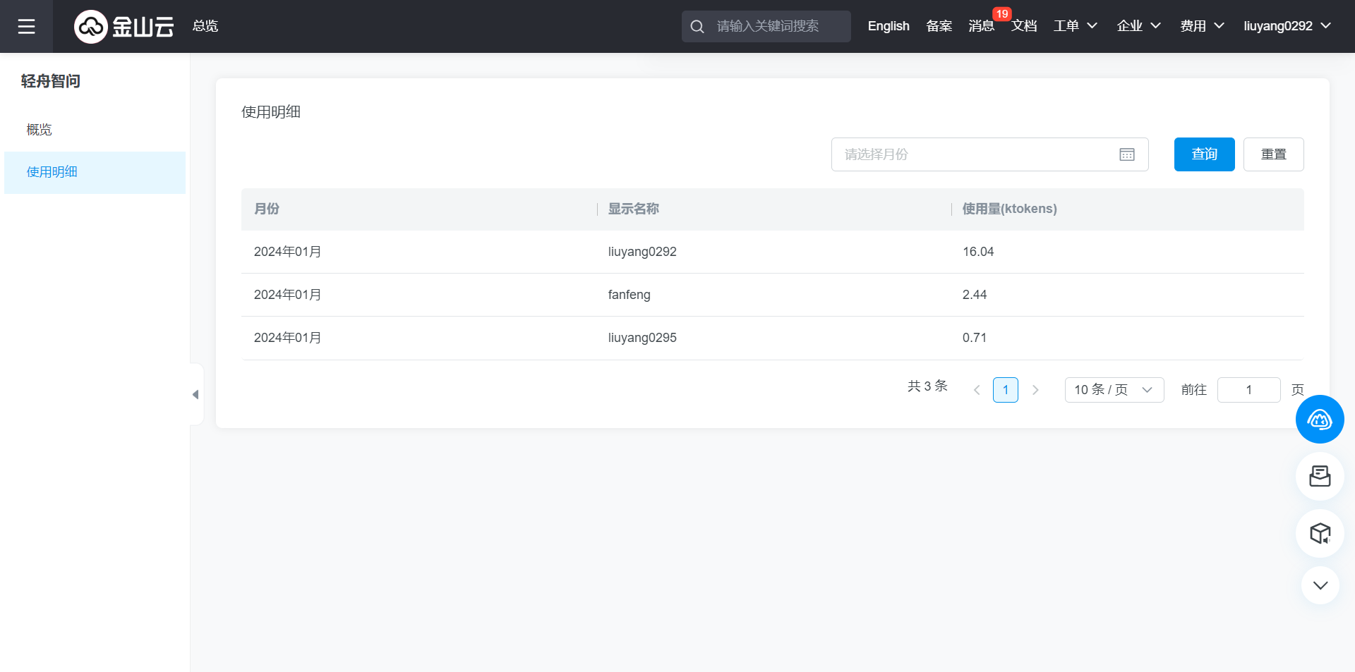 登录金山云控制台即可查看轻舟智问服务使用情况,包括服务有效期、月赠送用量、月使用量、子账号数量。